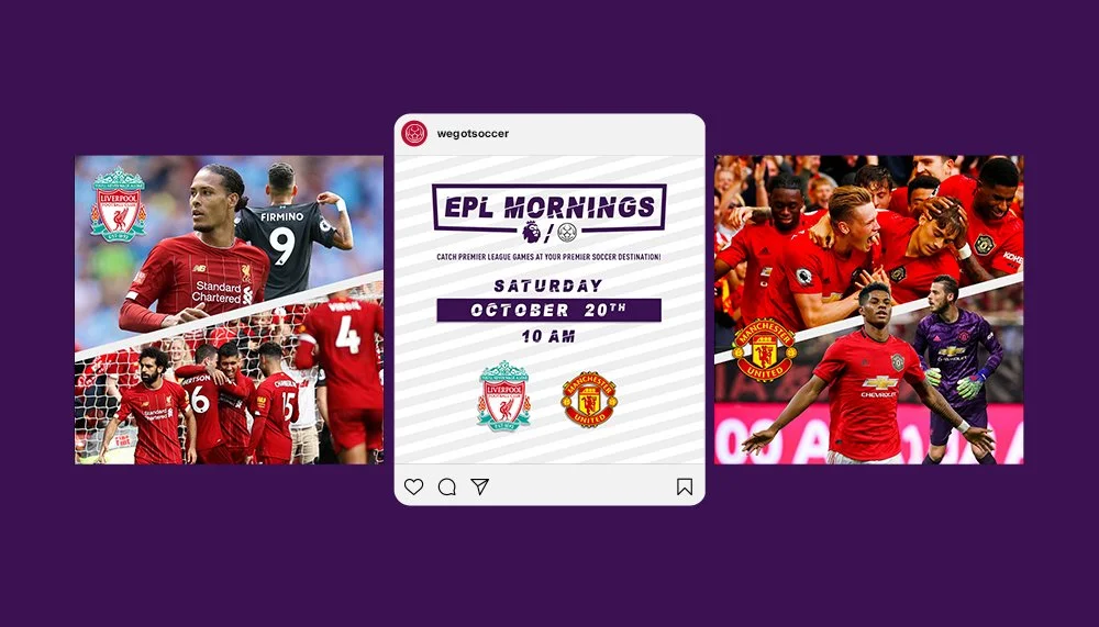 WeGotSoccer’s Foxboro (at the time) location hosted a month long Weekend English Premier League viewing party. I created a clean aesthetic with a nod to EPL branding to ensure a cohesive & aesthetic pleasing social branding to promote the events. Each week featured carousel instagram to showcase the morning match.